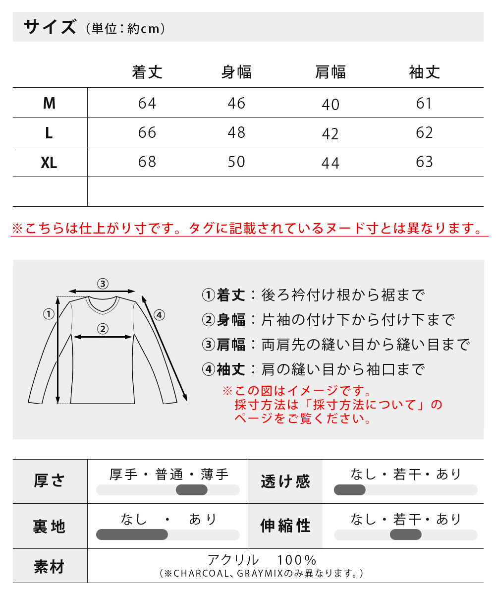 素材 : (本体)アクリル100% (チャコール/本体)アクリル80% ポリエステル20% (グレーミックス/本体)アクリル70% ポリエステル30%