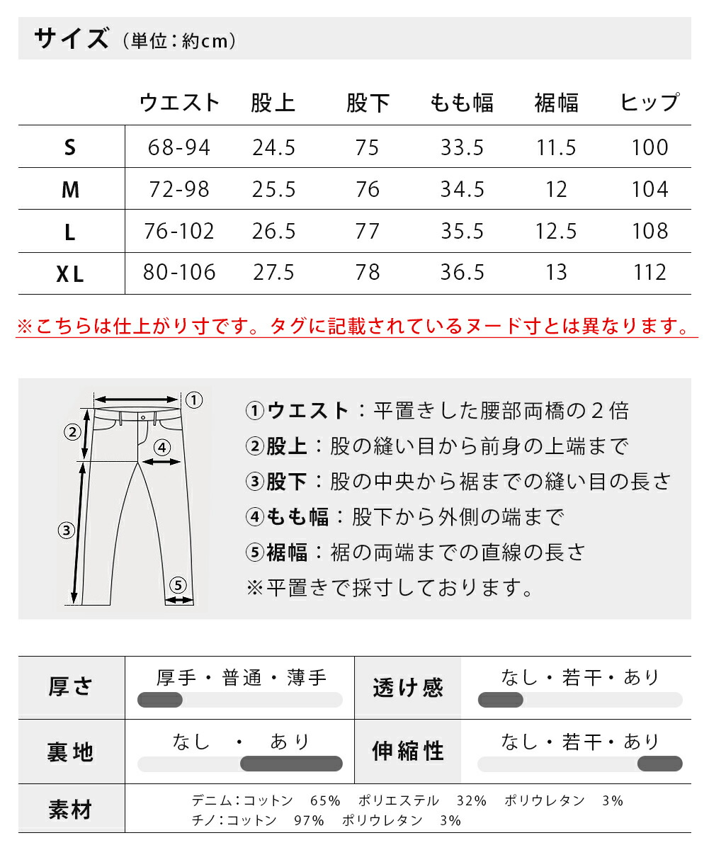 M : ウエスト72-98cm 股上25.5cm 股下76cm もも幅34.5cm 裾幅12cm ヒップ104cm