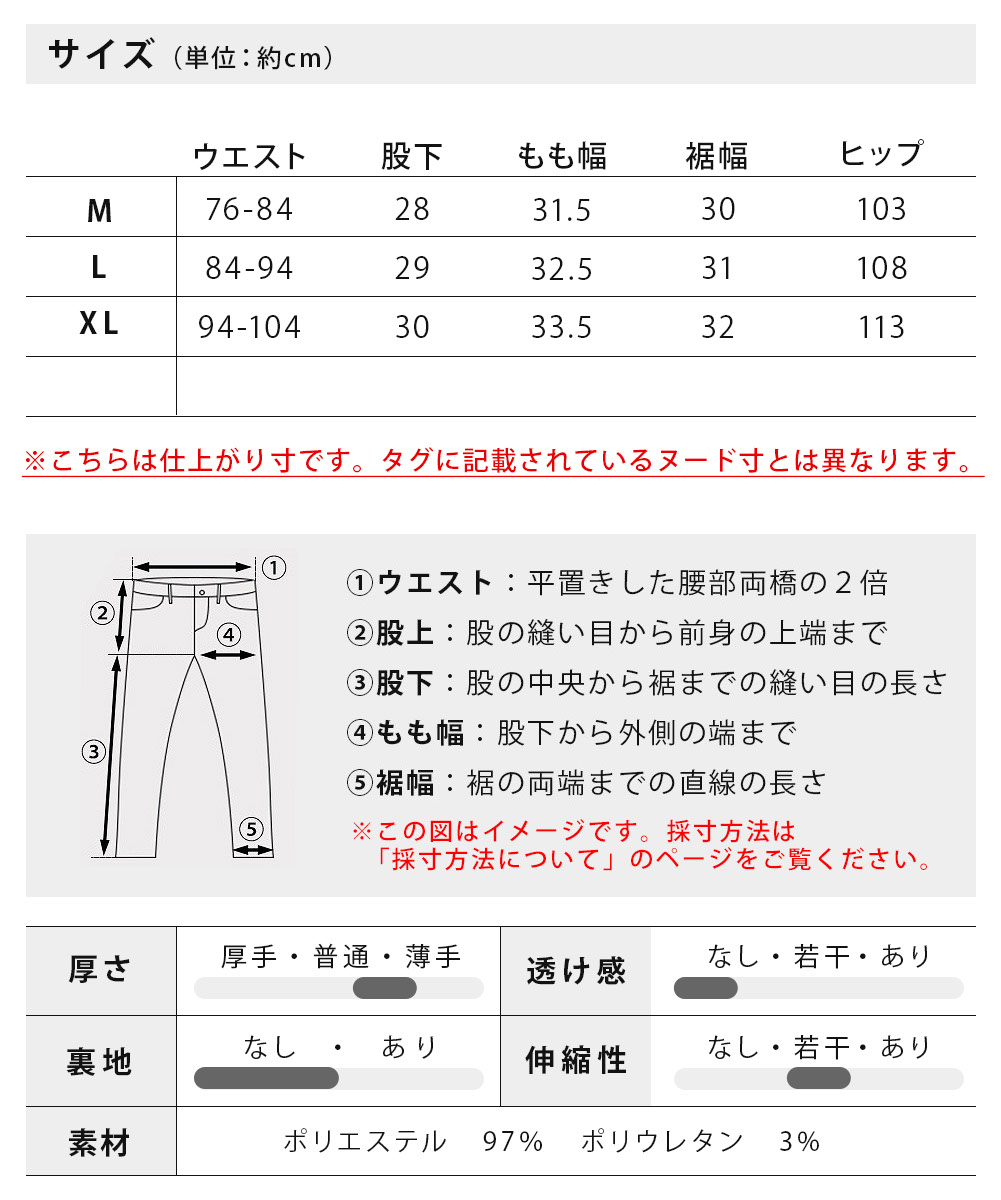 XL : ウエスト94-104cm 股下30cm もも幅33.5cm 裾幅32cm ヒップ113cm