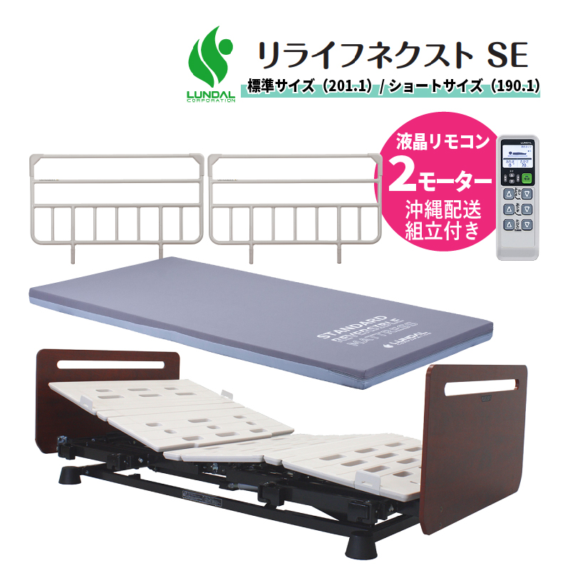 介護ベッド 沖縄配送 リライフネクストSE 薄型ボード ベッド本体+マットレス+サイドレール2本 3点セット 2モーター電動ベッド 組立配送付き 【代引き不可】