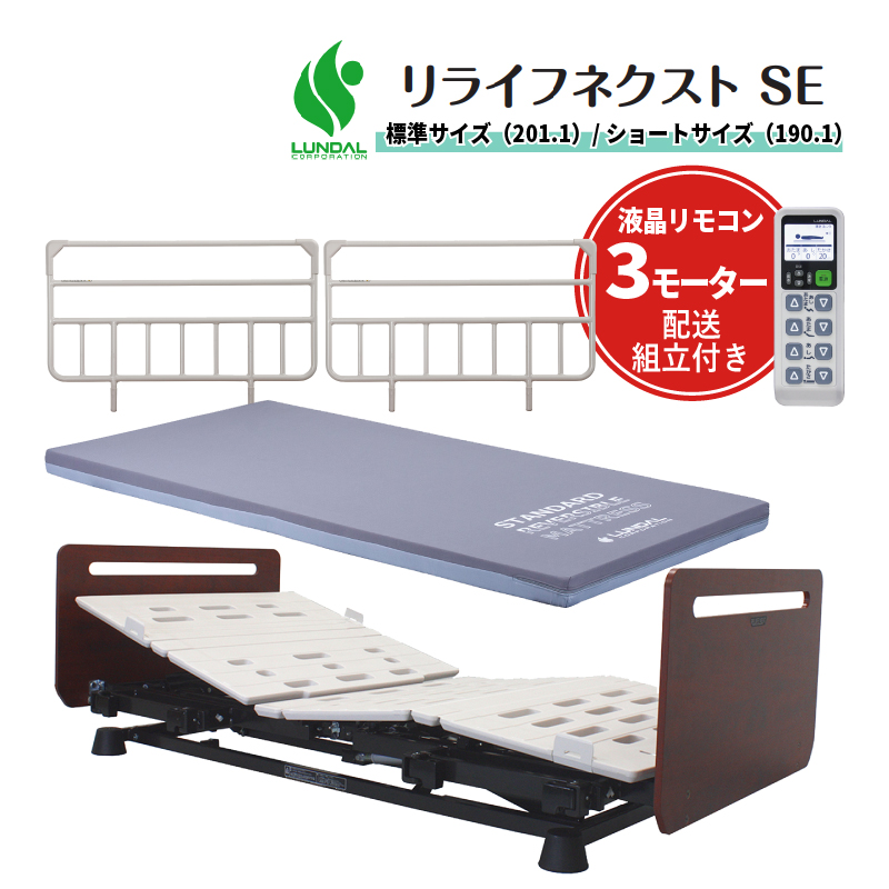 介護ベッド 本州配送 リライフネクストSE 薄型ボード ベッド本体+マットレス+サイドレール2本 3点セット 3モーター電動ベッド 組立配送付き 【代引き不可】