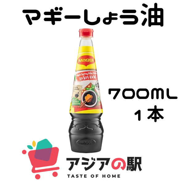 MAGGI しょう油 700mlMAGGI マギー ベトナム濃口ディップ用醤油だれ 700mlマギー ベトナムしょう油(醤油) ニョクトゥ 魔法のソース マギーソース バインミー 冷奴 餃子 シュウマイ 焼売 何でも合います♪◆商品説明◆ベトナムで人気のあるマギーの濃口ディップ用醤油名称:混合調味料(ディップ用たれ)原材料名:食塩、しょうゆ(小麦・大豆を含む)、砂糖/調味料(アミノ酸等)、カラメル色素、酢酸、増粘剤(キサンタンガム)、保存料(ソルビン酸K)、香料内容量:700ml 賞味期限:枠外下・下段に記載保存方法:直射日光を避けて常温で保存してください。原産国:ベトナム開封後は冷蔵庫で保管し、お早めにご使用ください。備考:商品のデザインは予告なく変更される可能性があります。ご了承下さい。