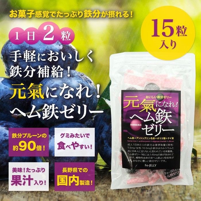 【メール便】鉄分 ヘム鉄 個包装 毎日 手軽 鉄分補給 貧血対策 元氣になれ!ヘム鉄ゼリー15粒