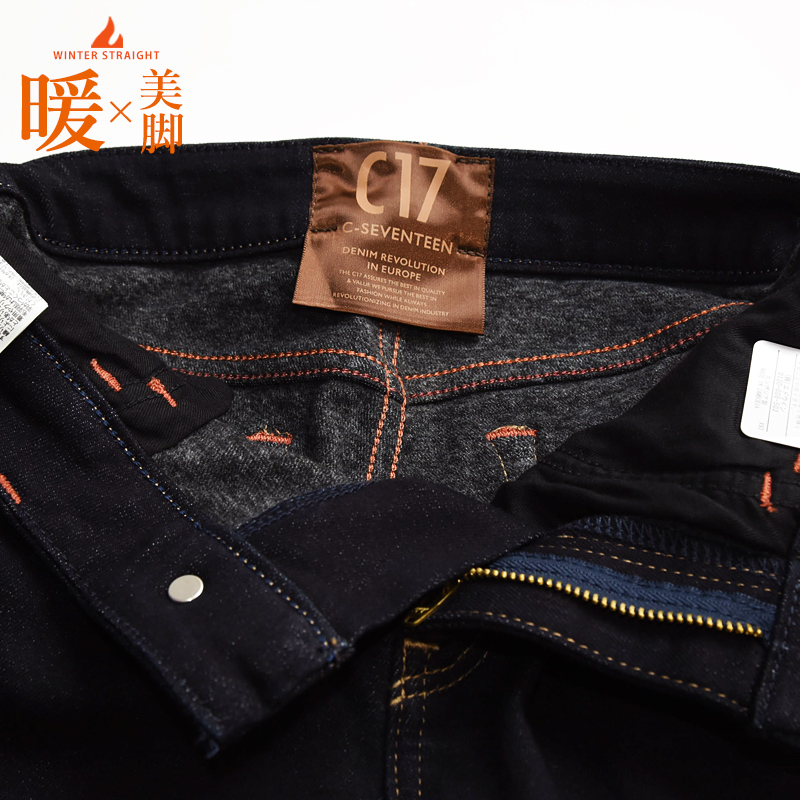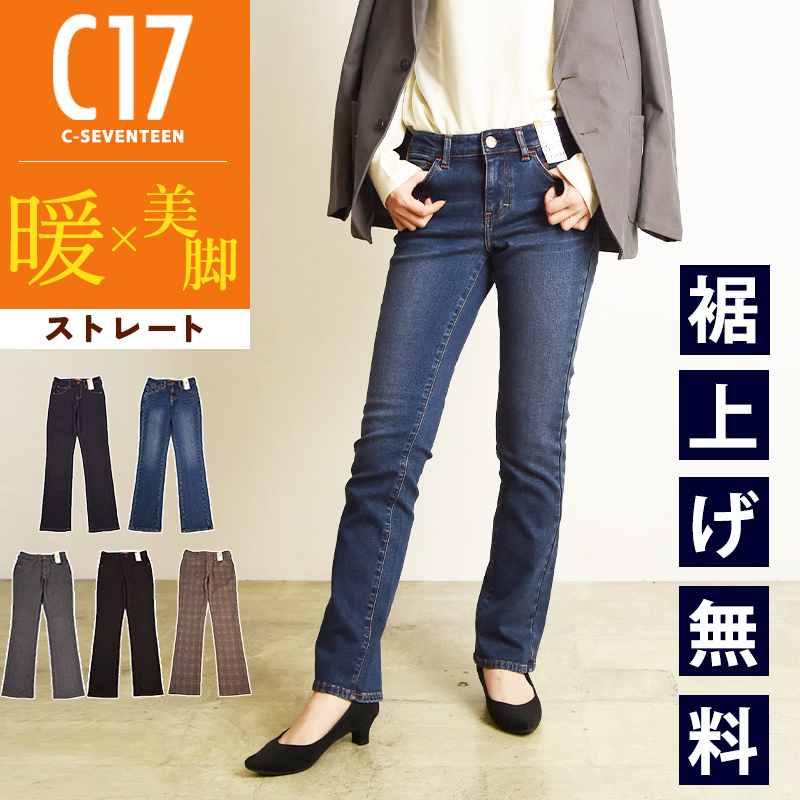 すっきりとまっすぐ伸びる脚を、視覚的に演出する独自のパターン設計を用いた「脚長効果抜群ストレート」美脚ジーンズです。定番BASIC CB323ストレートと連動したフィットで、シャープで洗練された印象を叶えます。ウエスト周りには、フラットフロントとカーブベルトを採用。座った時にも背中が浮き上がりにくく、美しいフィット感をキープします。穿き心地の良さと安心感に定評のあるC17こだわりの仕様です。ヒップの見え方にもこだわり、ヨーク幅とポケットの形・サイズを調整することで、余白の少ない小尻見え効果を実現しました。ストレッチ裏起毛デニムは立体感のあるこだわりのUSED加工色がイチオシ、ストレッチ裏起毛サテンは繊細な柄がポイント。2種類ともどのようなトップスとも相性が良く、コーデの幅が広がる万能さ。寒い冬コーデに活躍間違いなしのアイテムです。