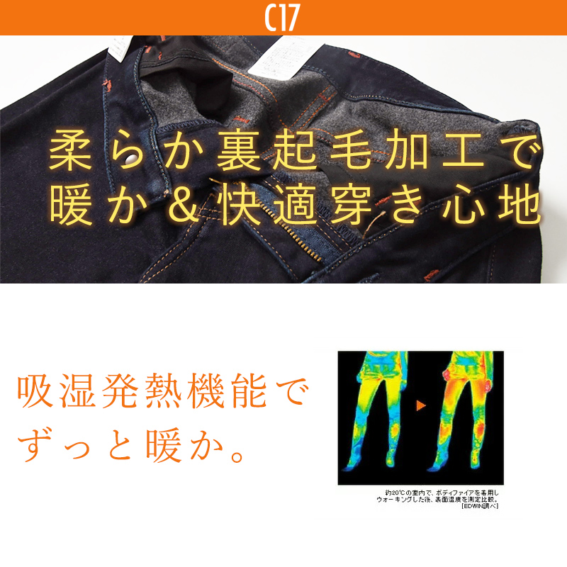 【デニム】:柔らかく抜群に伸びるノンストレスなストレッチ性が魅力。さらに、膨らみのある起毛感が特徴で、穿いた瞬間から暖かさを感じられるBODYFIRE素材です。