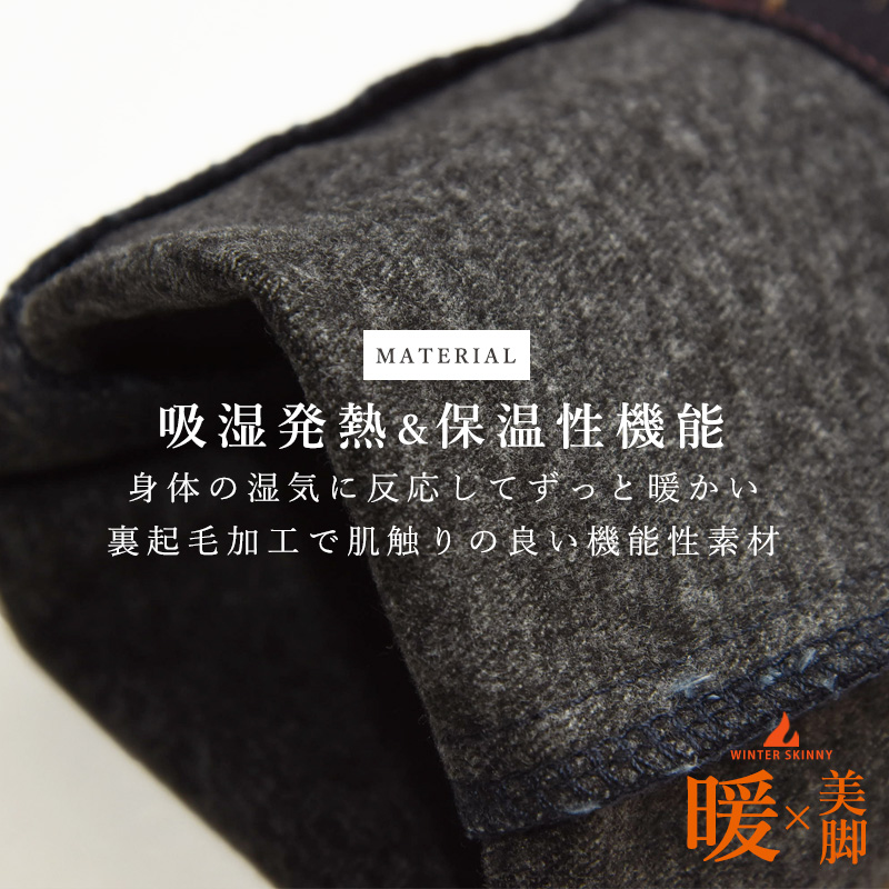 穿いた瞬間からやさしく暖かく感じ、抜群のストレッチ性と程よいホールド感と裏起毛で暖かさと肌ざわりの良さを感じる冬の美脚スキニーです。