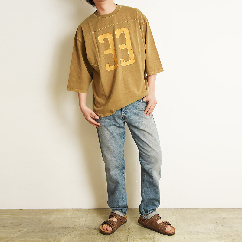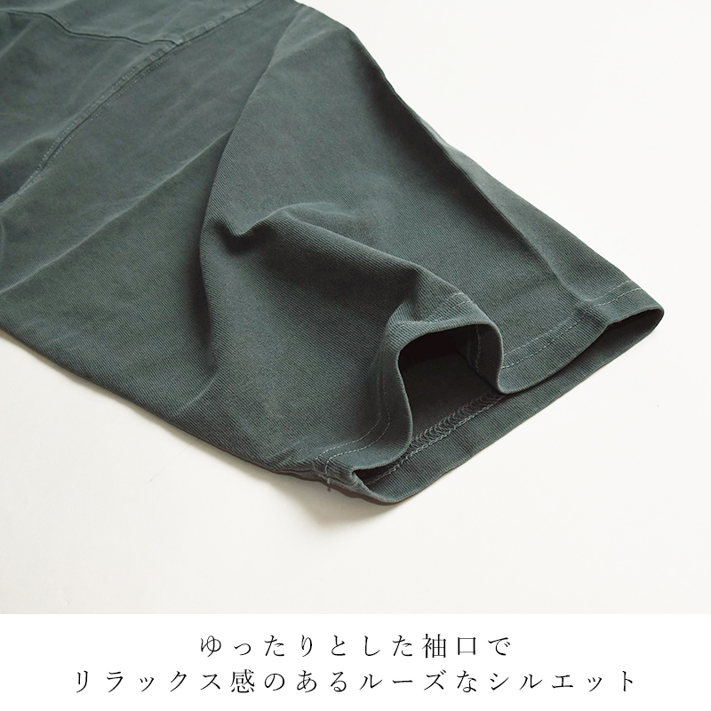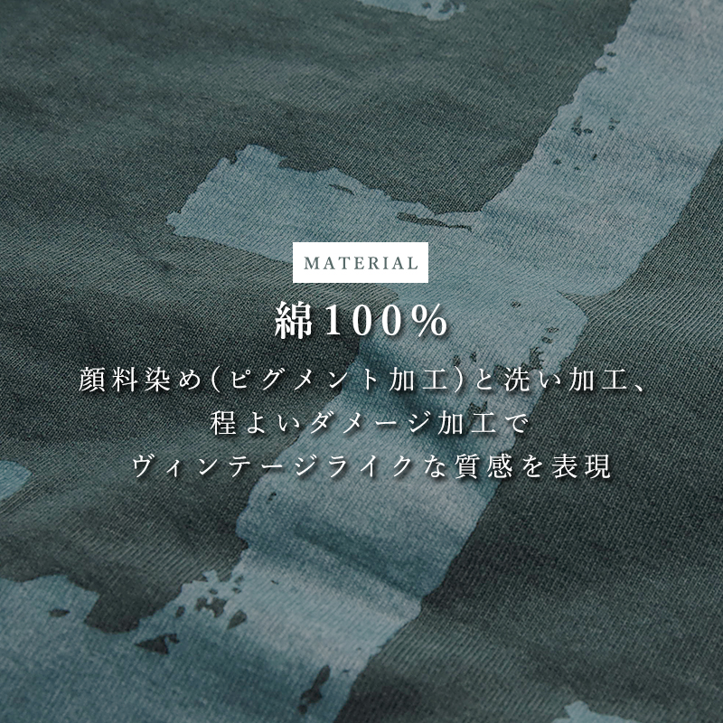 顔料染め(ピグメント加工)と洗い加工、程よいダメージ加工でヴィンテージライクな質感を表現した綿100%素材。