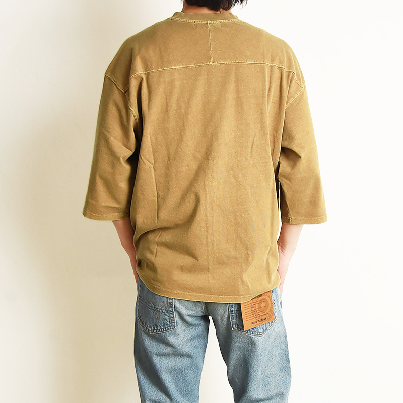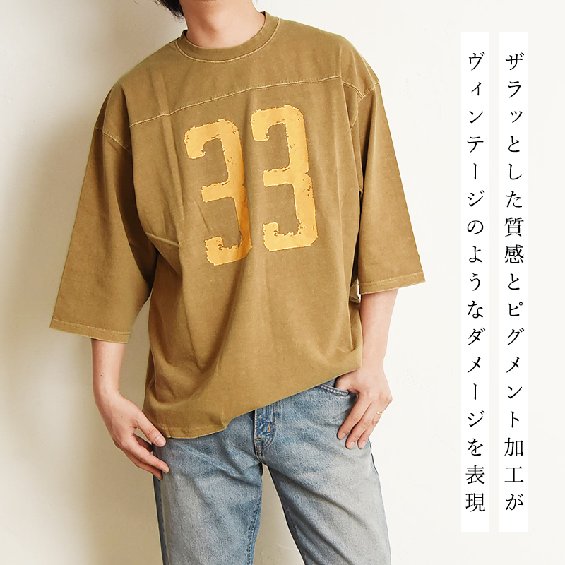 っヴィンテージライクな半袖クルーネックTシャツです。このTシャツは、柔らかく快適な綿100%素材を使用しており、日常の着用はもちろん、アクティブなシーンにも最適です。ザラッとした質感にピグメントと洗い加工、程よいダメージ加工でヴィンテージのような経年劣化をイメージ。