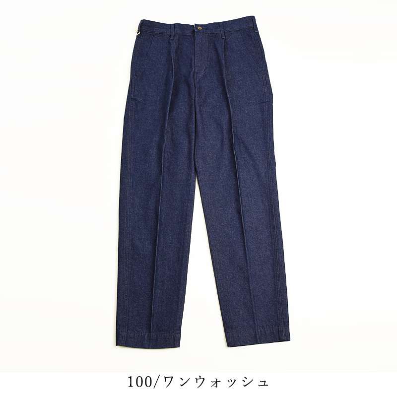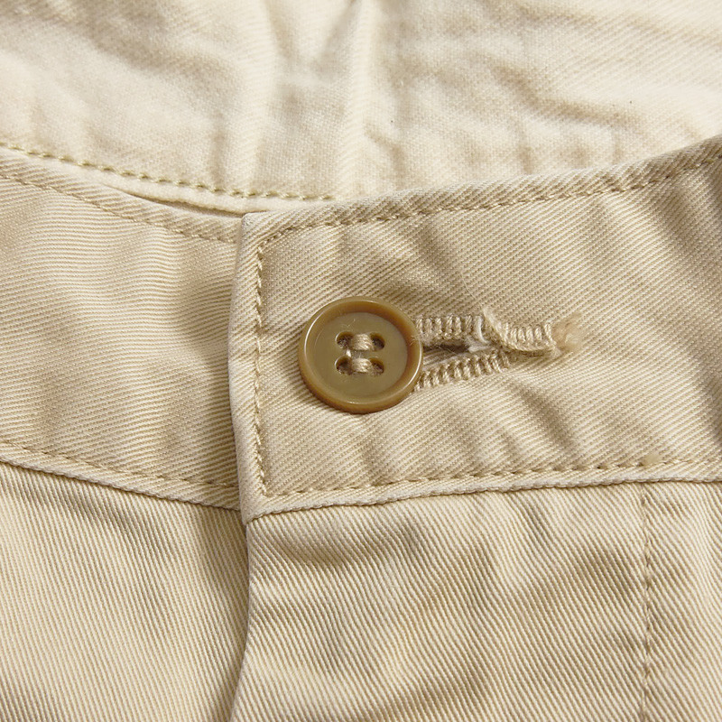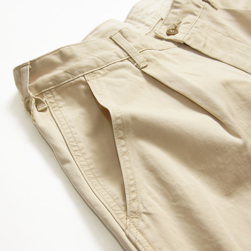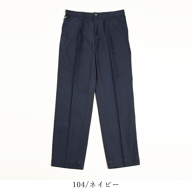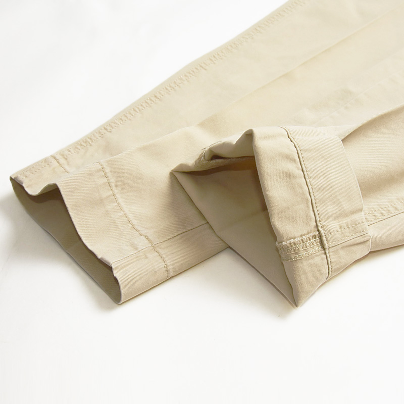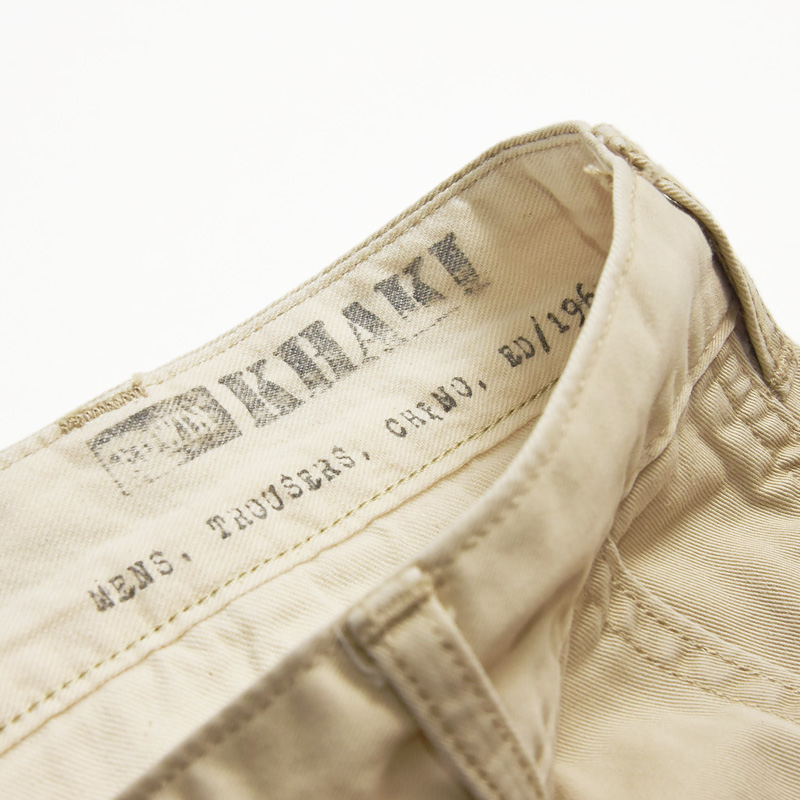 オーセンティックな雰囲気のある「KHAKIS TROUSERS CHINO」のテーパード。たて糸・よこ糸にコーマ糸を高密に打ち込んだヴィンテージチノ素材です。生地を地染めした後表面を顔料で染めることでパンツ全体に凹凸感のあるヴィンテージチノならではのUSED感を表現しました。ステッチは2本針にすることで穿きこんだ際のパッカリングも楽しめる仕様です。スラッシュポケットは少し角度をつけることにより、実用性も加味しました。ベルト裏はスレーキを使ったデザインです。スタンプを押すことによビンテージライクな見た目に仕上げました。程よいワタリの太さに1タックを入れることで、立体的なシルエットにしています。全体的にすっきりとしたシルエットなので、カジュアルなスタイルにもキレイ目スタイルにも対応可能です。