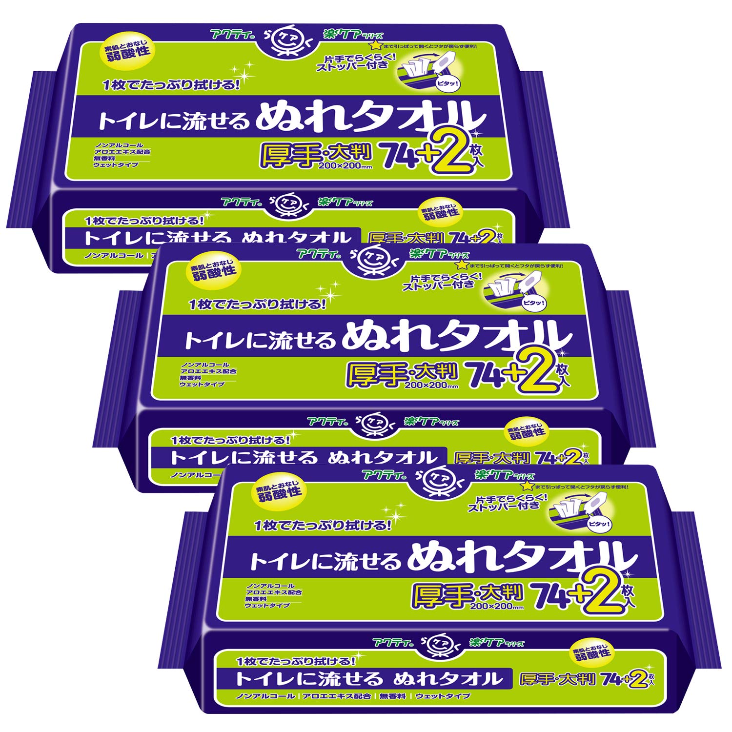 アクティ トイレに流せる ぬれタオル 大判・厚手 20×20cm 76枚 (片手でらくらく取出し口ストッパー)×3個セット