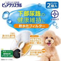 下部尿路の健康維持に! ワンちゃんにやさしい水分補給を! イオニック(イオン交換樹脂)が、水道水のマグネシウム、カルシウムを除去し、硬度を下げたワンちゃんにやさしい水(軟水)にします。 いつもきれいな水を! 活性炭(抗菌活性炭配合)が、カルキ臭を吸着しおいしい水に。不織布で気になる食べカス、抜け毛、ホコリなどをキャッチして、キレイな水を維持します。 下部尿路の健康維持のために、水道水のマグネシウム、カルシウムを除去します。マグネシウム、カルシウムは動物にとって大切なミネラルですが、過剰摂取を防ぐことで健康に配慮できます。日頃から食事、肥満、運動不足なども注意が必要です。異常に気付いた場合は、早急に獣医師にご相談ください。この商品は病気の治療などを目的にしたものではありません。内容量:2個(約2カ月分) 適応機種:ピュアクリスタル1.5L/2.5L ブルーム グラッシー