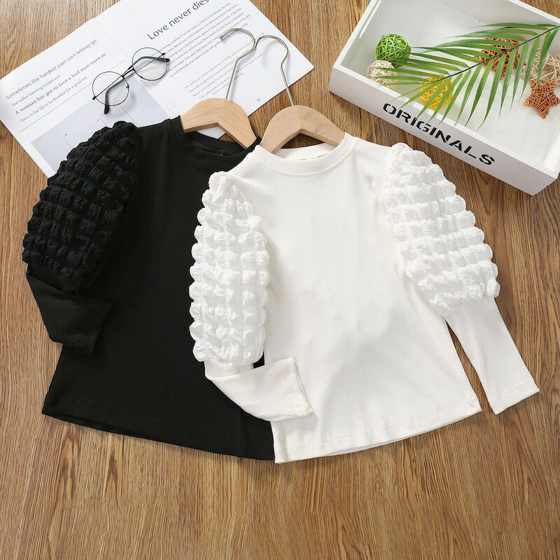 子供 トップス 女の子 長袖 パフスリーブ プルオーバー カットソー Tシャツ キッズ 無地 小学生 幼稚園 子ども ジュニア ガールズ 可愛い おしゃれ カジュアル お出かけ 春 秋 90cm 100cm 110cm 120cm 130cm 140cm ホワイト 白 ブラック 黒 カジュアル