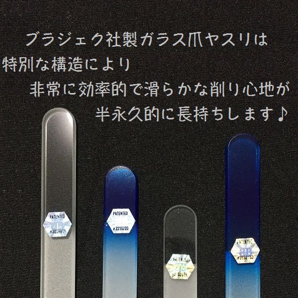 ●ブラジェク・ガラス爪やすりは、普通のガラスの約4倍の硬さの強化耐熱ガラスで作られており、 何十年使ってもその機能が衰えることなく きめ細かさを維持できます。