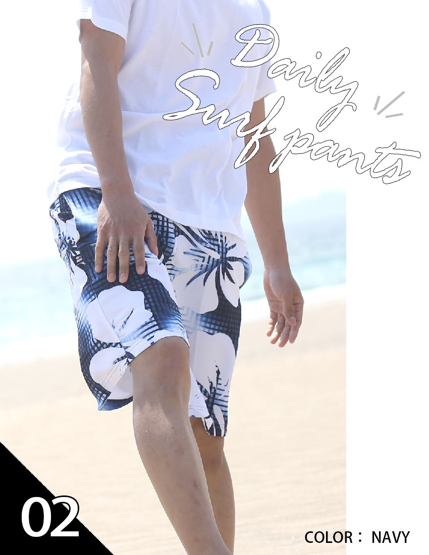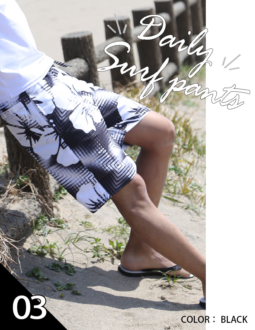 デザイン性の高い膝上サーフパンツ。ウエストゴム仕様で安心!サイズ選びもMから5Lまであって豊富!