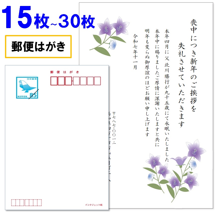 喪中はがき 印刷 15枚〜30枚 名入れ有 官製はがき(郵便はがき) 送料無料