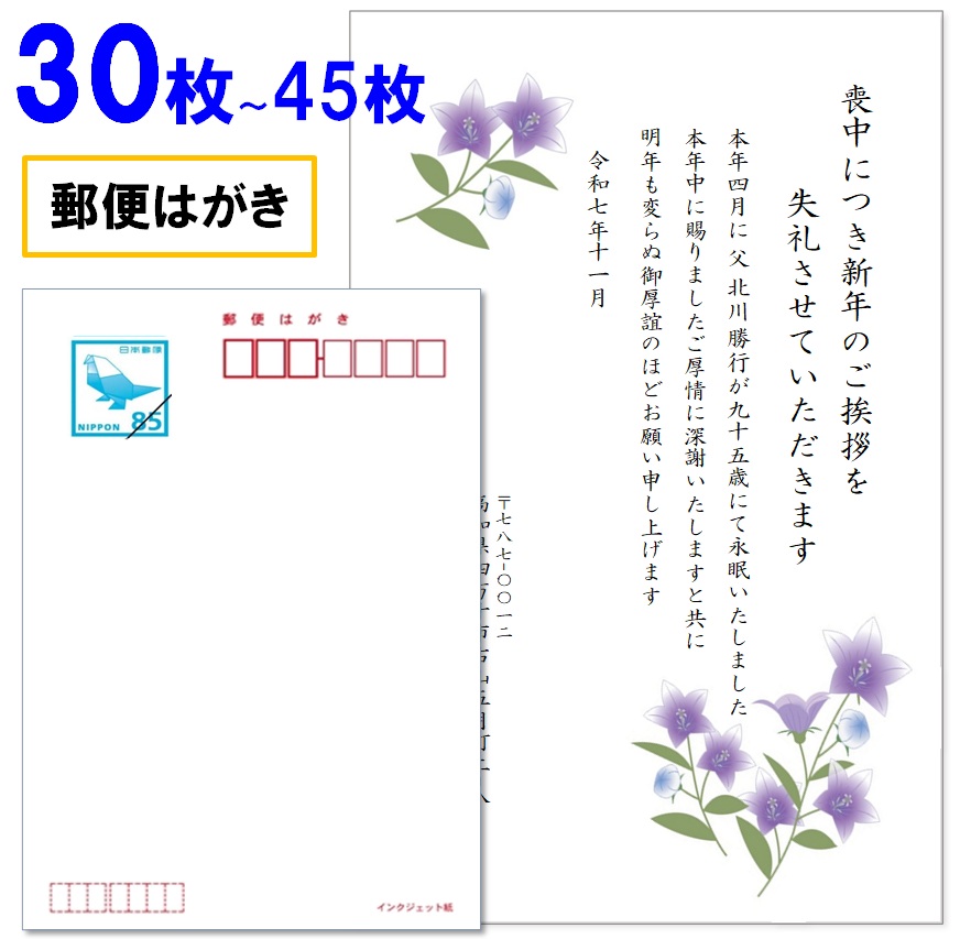 喪中はがき 印刷 30枚〜45枚 名入れ有 官製はがき(郵便はがき) 送料無料