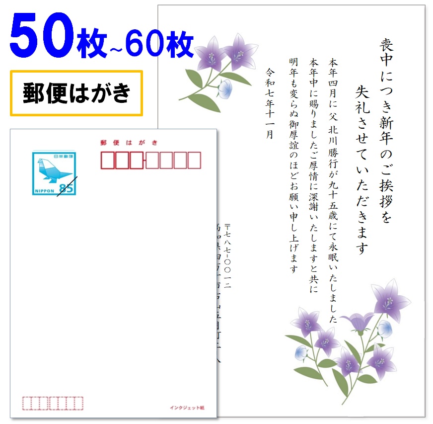 喪中はがき 印刷 50枚〜60枚 名入れ有 官製はがき(郵便はがき) 送料無料