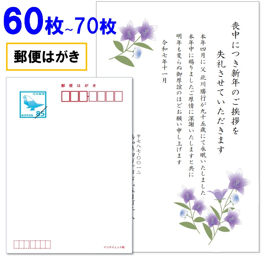 喪中はがき 印刷 60枚〜70枚 名入れ有 官製はがき(郵便はがき) 送料無料