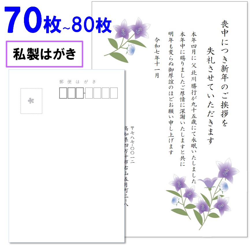 喪中はがき 印刷 70枚〜80枚 名入れ有 私製はがき 送料無料