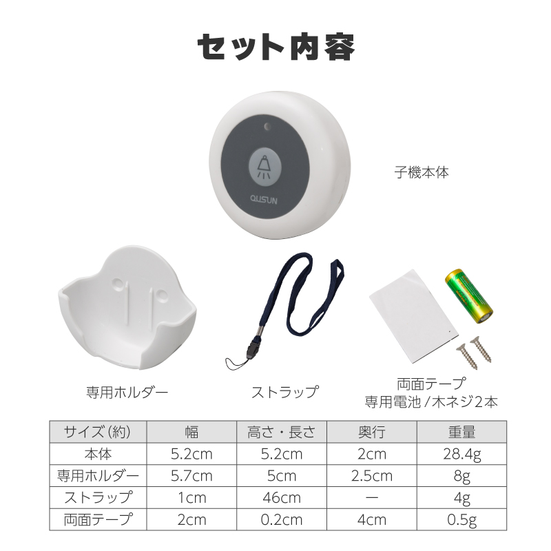 ■ セット内容・ 子機本体 1個・ 専用ホルダー 1個・ モニター電池(DC12v/23A)1個・ ストラップ 1本・ 両面テープ 1枚・ 木ネジ 2本