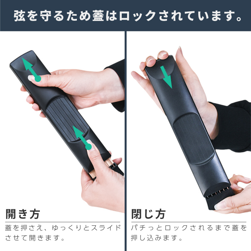 ■蓋は弦の保護の為ロックされています。蓋を押さえながらゆっくりとスライドさせて開けてください。