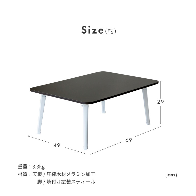 テーブル 折りたたみ 一人用 ローテーブル 69cm 49cm 29cm 長方形 白 黒 ナチュラル ブラウン 折り畳み 1人用 小さい 小さめ おしゃれ 新生活 一人暮らし 軽量 ホワイト ブラック 木目 狭いワンルームやプライベートルーム、サブテーブルにもおすすめの折り畳めるコンパクトサイズのミニローテーブルです。