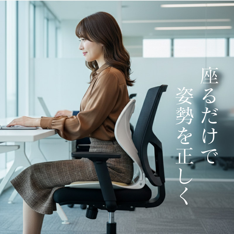 前傾カーブが骨盤を自然に支え、背筋が真っすぐに。姿勢リセットが無理なく続く。