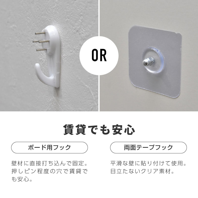 賃貸でも安心して使えるボード用フックと両面テープフックを用意。押しピン程度の穴で固定でき、目立たないクリア素材のテープも使用可能。高品質な素材で耐久性があり、長く使える安心感があります。