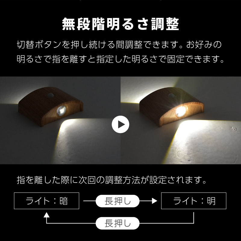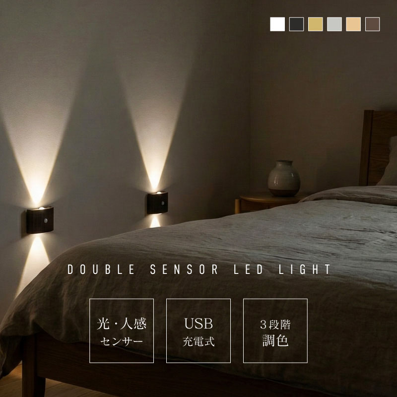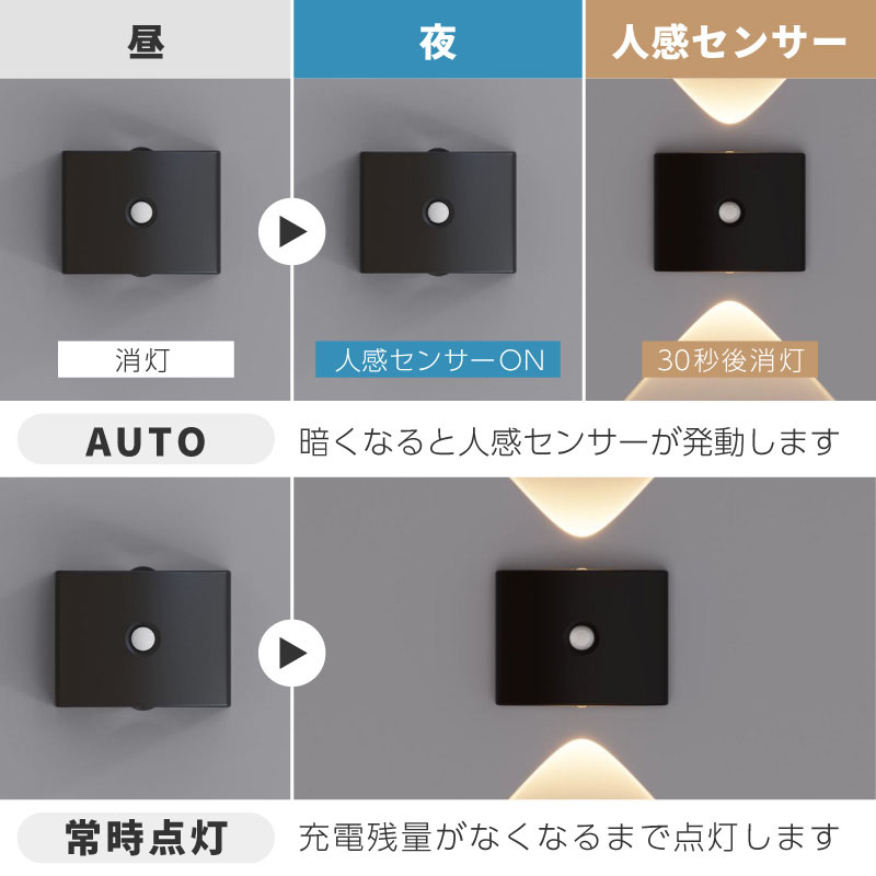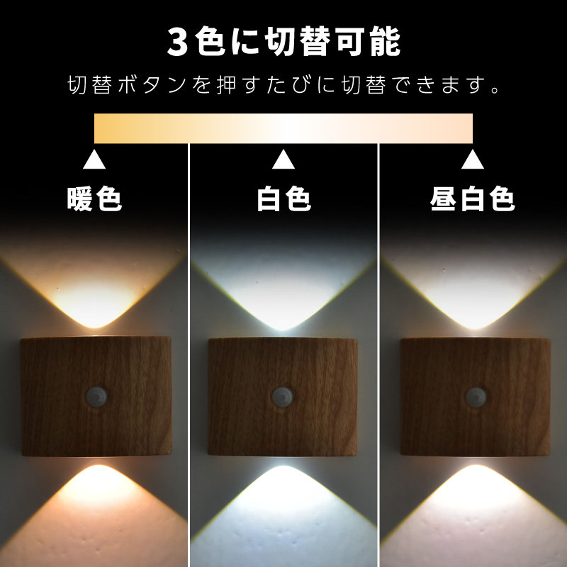 センサーライト 照明 LED 小型 人感センサーライト 自動点灯 明暗センサー 人感センサー USB 充電 マグネット 配線不要 おしゃれ 室内 玄関 廊下 トイレ 階段 常夜灯 木目-----黒 白 ゴールド シルバー 昼白色 電球色 温白色人感センサーで自動点灯。