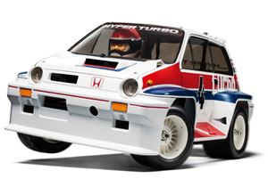 | 商品特徴 | 商品解説: 【 コミカルボディでやんちゃな走りが面白い 】 1983年に登場したHonda シティ ターボのレース仕様をコミカルにアレンジしたボディが魅力の電動ラジオコントロールカー組み立てキットです。ボディはシャープな彫刻の耐衝撃樹脂製。ヘルメットをかぶったドライバー人形もセットして、走らせる楽しさを高めます。また、ボディを引き締めるレッドとブルーのグラフィックやゼッケン、ドライバー人形のヘルメットの塗り分けライン用ステッカーも付いています。シャーシはコンパクトな後輪駆動WR-02C。左右非対称のトレッドパターンを持つ、前後で幅の異なるタイヤがレーシーなムードを盛り上げます。 【 後輪駆動のWR-02Cシャーシを採用 】 シャーシはホイールベースを185mmに設定した後輪駆動のWR-02C。ギヤケースをはさむ形で固定するモノコックフレームを採用し、外側にサイドメンバーを装着して剛性を高めています。モーターはシャーシのほぼセンターに搭載し、ギヤで後輪にパワーを伝達。密閉式のギヤケースにはデフギヤを内蔵しました。そして、走行用バッテリーを車体後部に縦置きしているのがポイント。重量物を高めに搭載することで、急発進するだけでダイナミックなウイリー走行も可能。後部には転倒を防ぐ、ローラー付きのウイリーサポートも装備しました。また、ステアリングサーボはシャーシ中心線上にセット。等長2分割タイロッドを採用し、くせのない操縦特性を生み出します。サスペンションは走破性の高い4輪ダブルウィッシュボーン。ギヤボックスはモーター装着状態で組み立てずみとするなど、作りやすさも特長です。 【 基本スペック 】 ●全長345mm、全幅210mm、全高165mm ●ホイールベース185mm ●トレッド=フロント165mm、リヤ170mm ●タイヤ幅/径=フロント35/70mm、リヤ42/70mm ●フレーム=樹脂製モノコックタイプ ●駆動方式=後輪2輪駆動 ●サスペンション=ダブルウィッシュボーン4輪独立 ●ダンパー=前後ともフリクション ●ステアリングタイロッド=2分割 ●デフギヤ方式=3ベベルデフ ●ギヤ比=1:16.5 ●モーター=トルクチューン ●スピードコントローラー=ESC仕様(別売) 【 別にお求めいただくもの 】 ●ファインスペック2.4G 電動RCドライブセット ●送信機用単3形電池4本 カテゴリー: RCモデル 仕様: 全長=345 mm 写真はキットを組み立て、塗装したものです 【対応シャーシ】 WR-02Cシャーシ |
