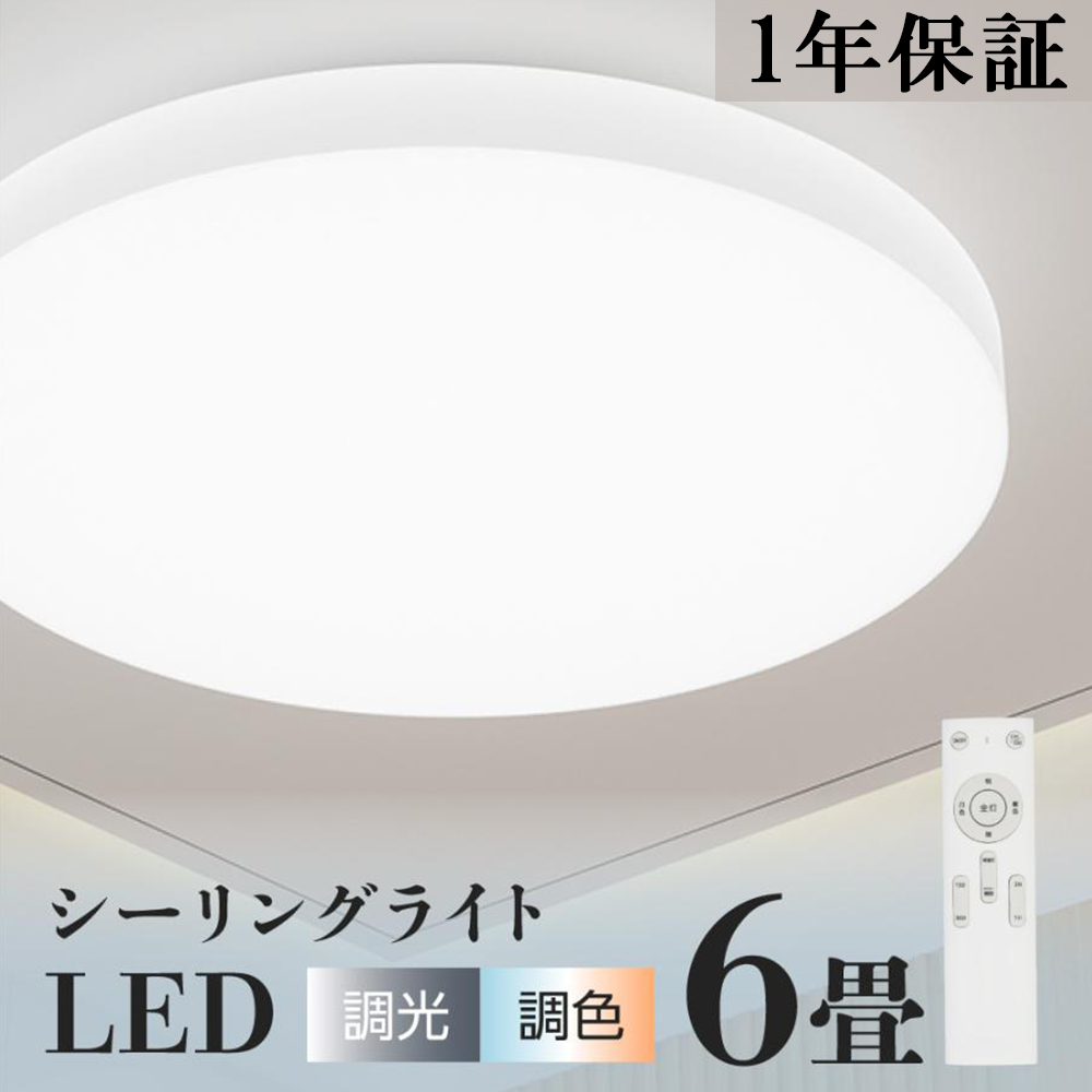 【製品仕様】商品サイズ:約Φ30xH6.5cm / カラー:ホワイト /適用畳数:6畳 / 調色:12段階 / 調光:12段階/ 消費電力:24w / 定格光束:3000lm / 色温度:3000k/6000k