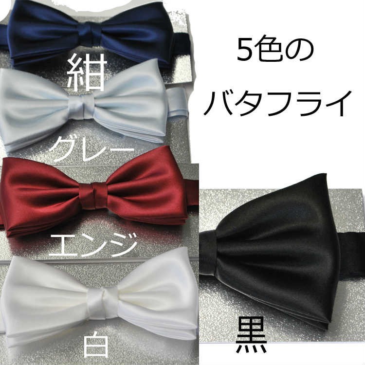 5色の蝶タイバタフライタイプ  ▼プラスチックケースに入れて配達します。  ▼衿回りは50cmまで対応可能♪  店長オススメポイント!! ポイント1・ この商品だけのお買い上げの場合、送料が掛かります。 ただし、ほかの商品と同梱していただき、一配送先が税別10,000円以上ですと送料無料になります♪ ポイント2 Q:カマーバンドと蝶タイは別々の物でも良いの? A:カマーバンドとクロスタイは同じ柄、色目にしましょう。 ポイント3. この商品は企画から製造まで日本で作られました。  ▼ブラック  ▼上から紺・シルバーグレー・エンジ・ホワイト  |