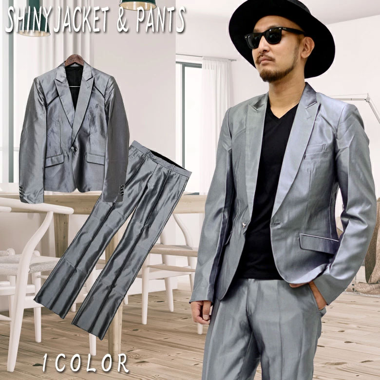 【閉店セール】メンズ 上下セットスーツ 1Bテーラードジャケット スラックス シューカット ピーク度ラペル カラーストーンボタン シルバーグレー