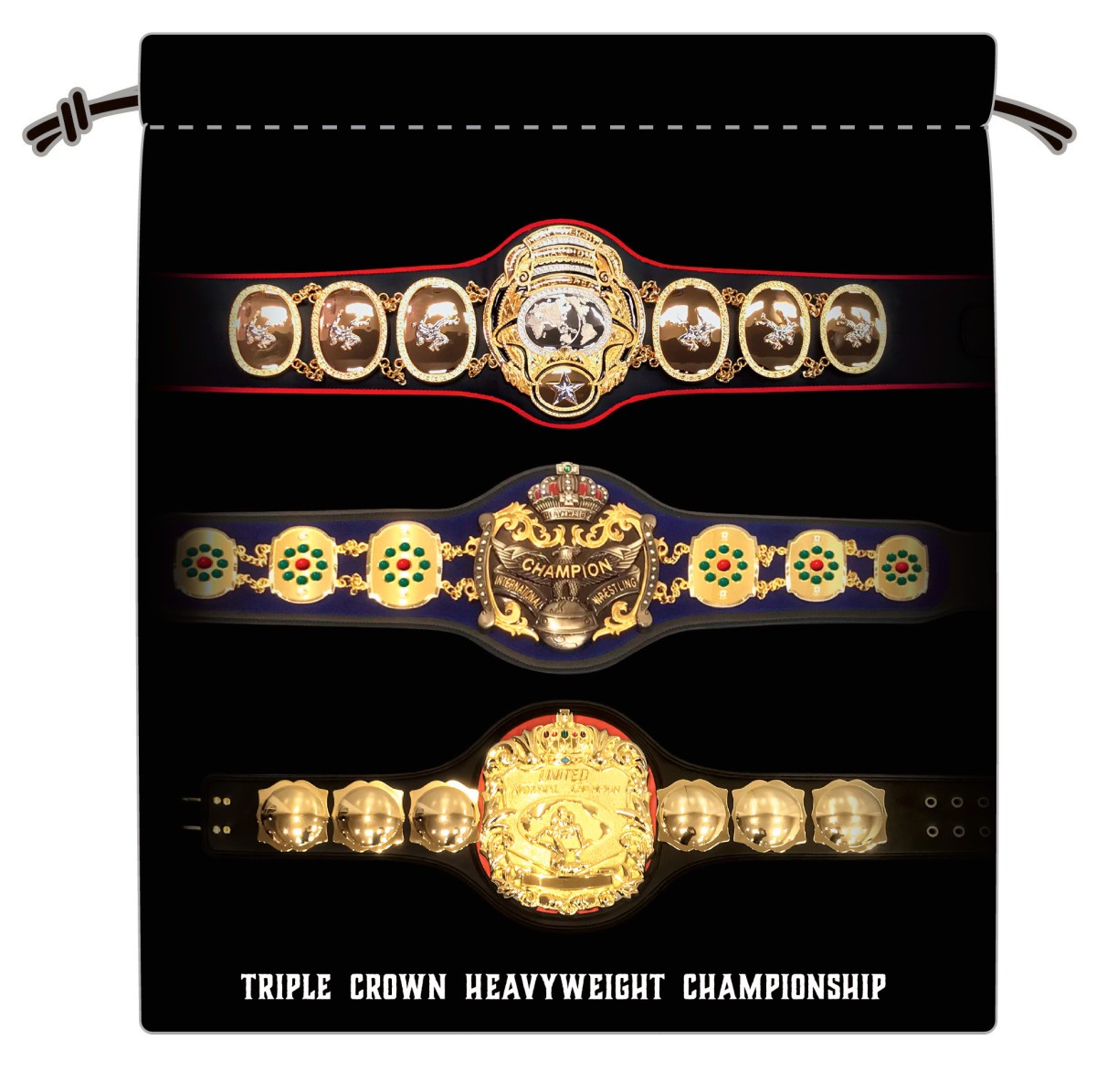 三冠ベルトであるPWF、インター、UNのベルトが描かれた巾着