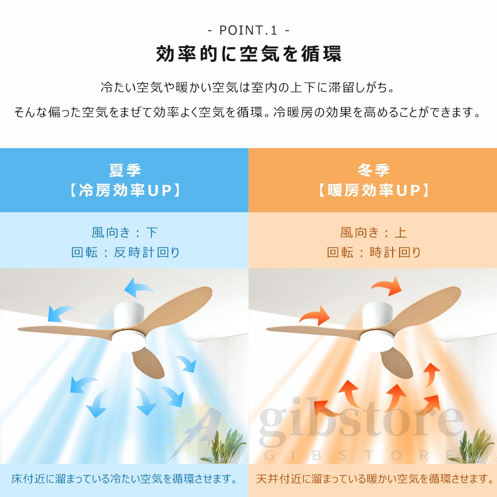 夏は天井の熱気を拡散するため、風を部屋全体に行き渡らせます。また心地よい風がカラダにあたることで体感温度を下げることができます。