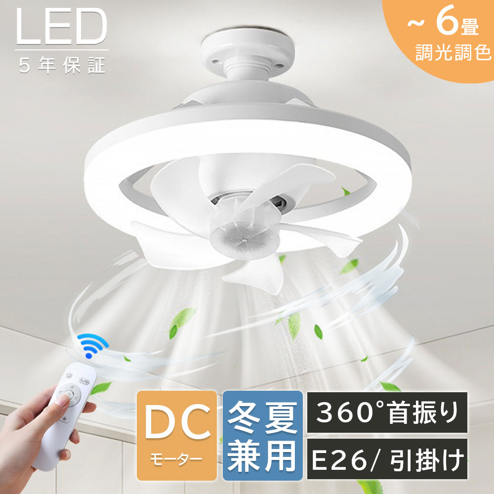 シーリングファンライト led E26金口 調光調色 360°自動首振り 6畳 3段階風速調節 シーリングファン オシャレ 寝室 トイレ 照明器具 扇風機 照明 小型 静音