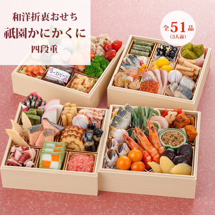 昔ながらの和のおせちに、お子様でも食べやすい洋風メニューも詰め込んだ和洋折衷おせちです。家族みんなで4段にぎっしりと詰まったメニューをお楽しみください。
