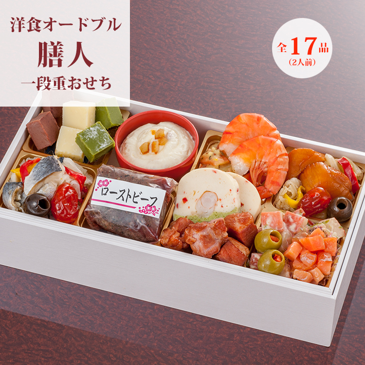 膳人(かしはびと)とは、古語で料理人の意。全17品のコンパクトな洋風オードブル重です。