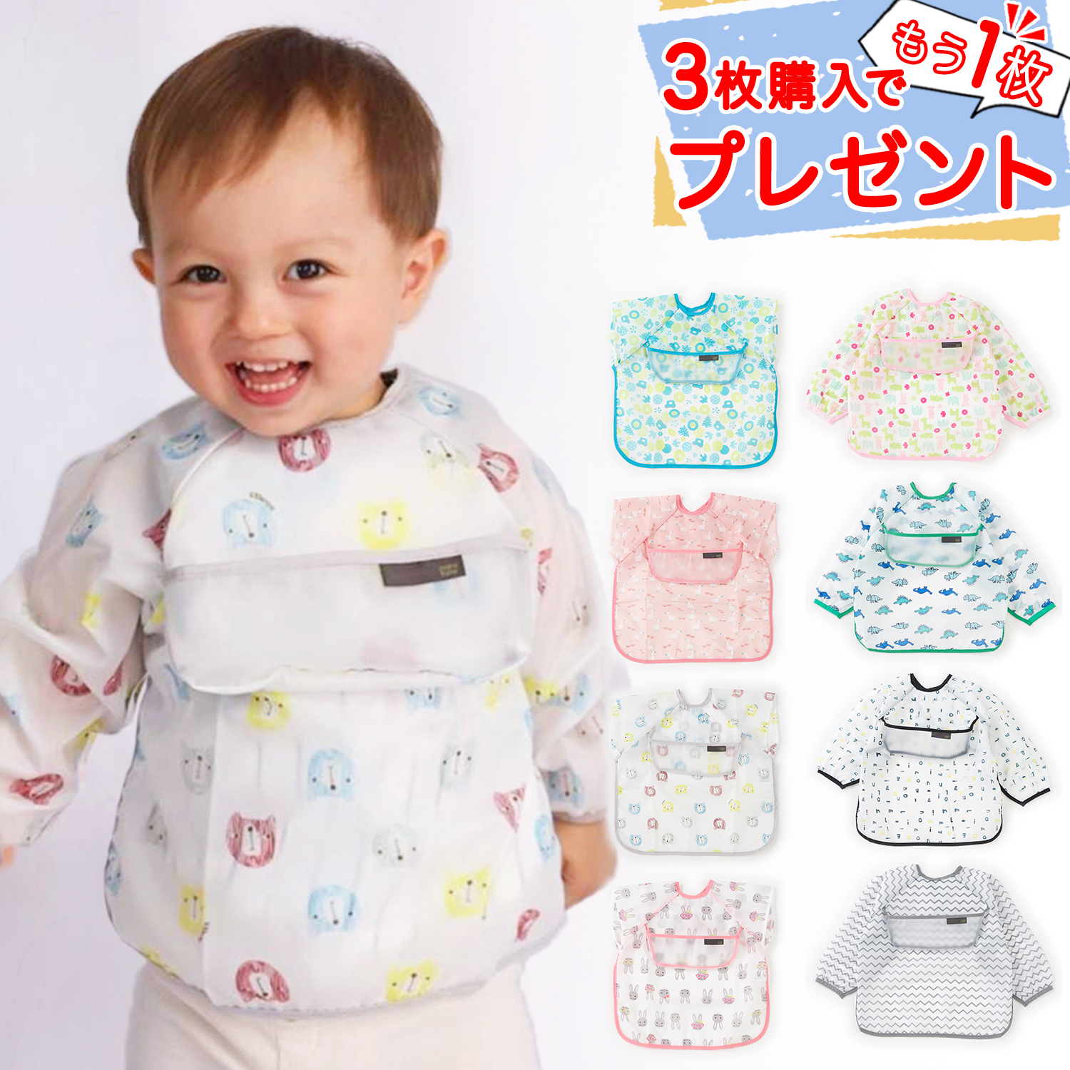 【3枚同時購入でもう1枚追加プレゼント】お食事エプロン スモック 長袖 半袖 離乳食 入園準備 お食事用エプロン 防水 上段ポケット 食事エプロン