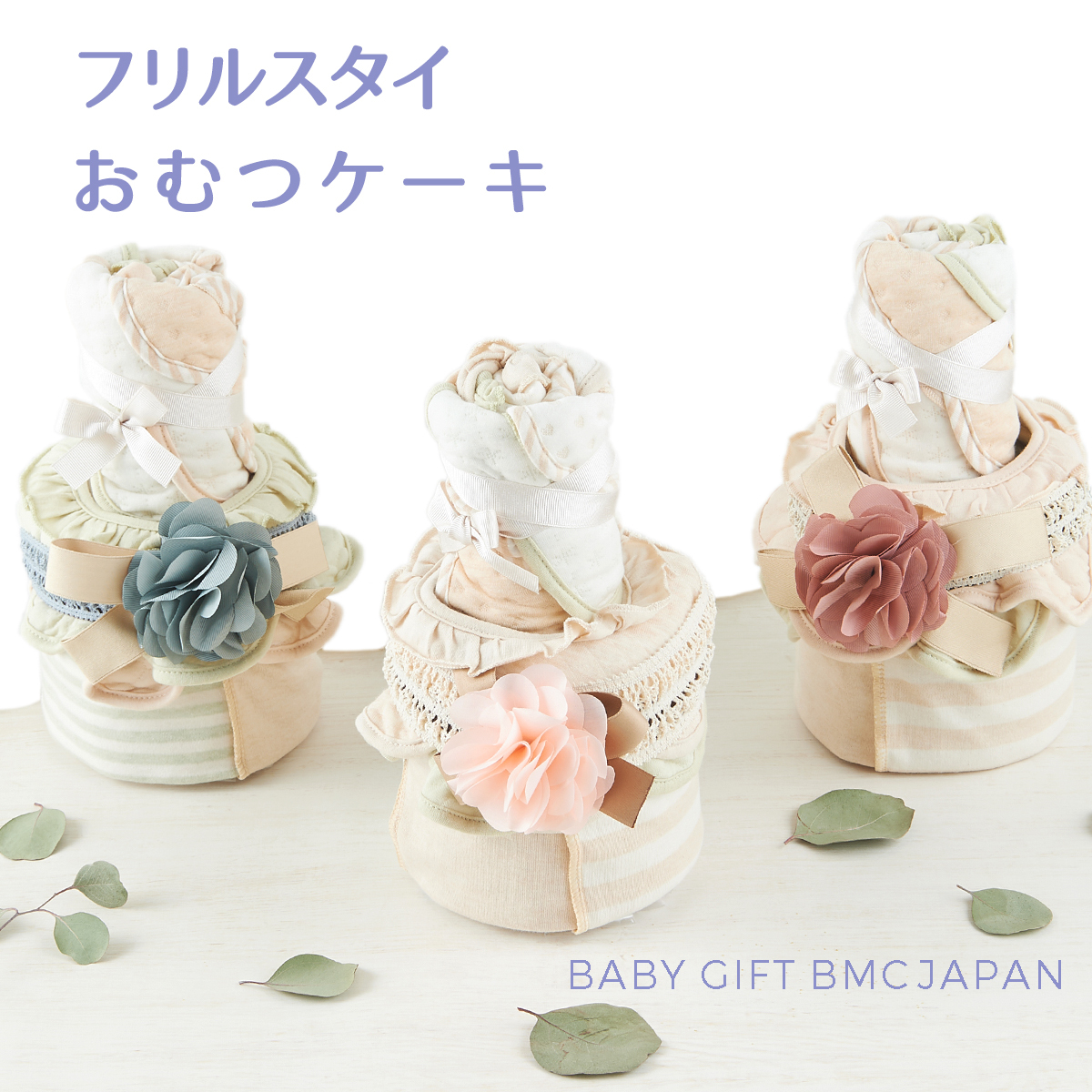 出産祝い ギフト おむつケーキ オムツケーキ 2段 フリルスタイ セット かわいい 女の子 よだれかけ ビブ プチギフト 誕生日