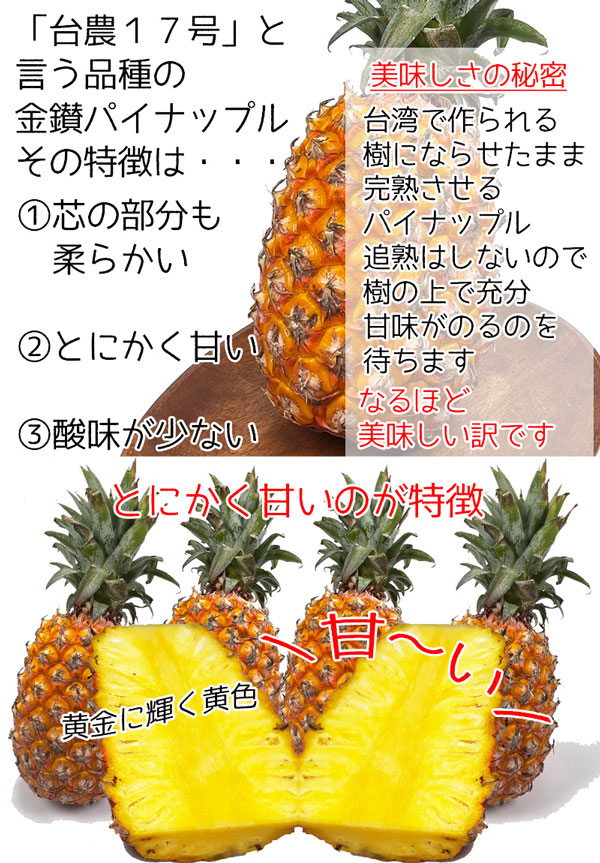 | 商品名 | 台湾 パイナップル 2〜3個入り 金鑚パイナップル (きんさん) 台湾パイン クール便配送 母の日・手土産・お供え・ご家庭へのギフト・送料無料 |