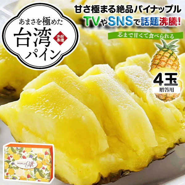 ※台湾からの輸入状況や通関手続き、農園での収穫状況により、出荷が遅れることが予想されます。ご注意願います。※沖縄県・北海道への配送は【プラス1000円】ご注文後に料金が加算されます。■内容量: 台湾パイン 極み 4玉セット(1箱2玉入りを2箱でお届け) 贈答用・化粧箱入り