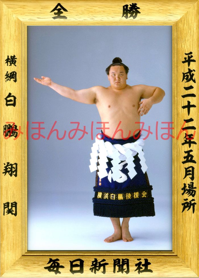 平成22(2010)年5月場所で14回目の優勝を全勝で成し遂げた、横綱 白鵬翔関の優勝ミニ額です。