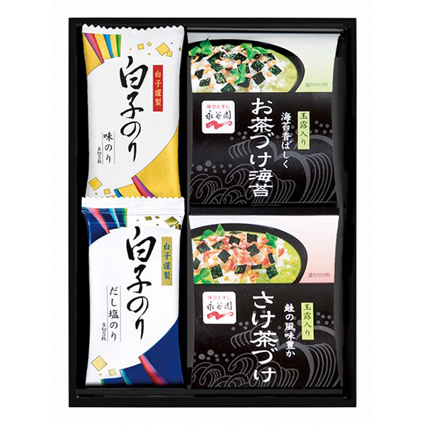 内容:●セット内容:白子のり味付のり(8切5枚)・白子だし塩のり(8切5枚)各2、永谷園お茶づけ海苔(3袋入)・永谷園さけ茶づけ(3袋入)各1 ●加工地:日本(乾海苔/国内産)【小麦・エビ】