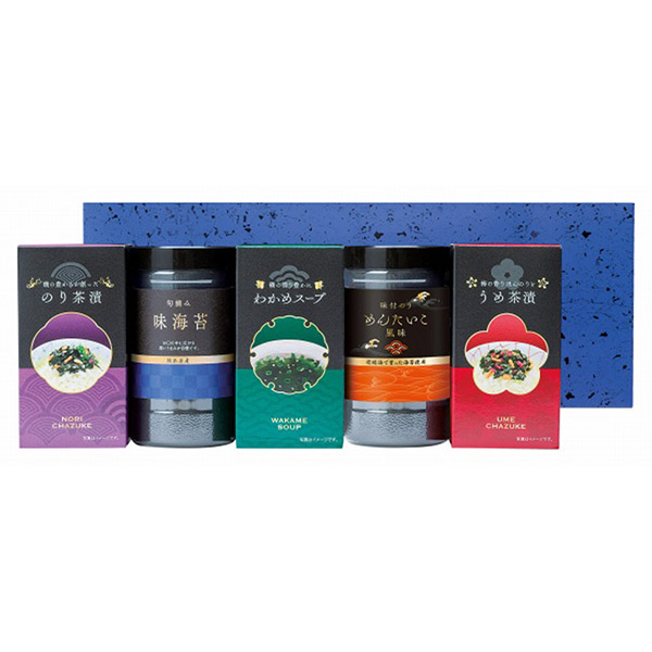 内容:●セット内容:味海苔(8切24枚)・めんたいこ風味味付のり(8切28枚)・のり茶漬(4袋入)・うめ茶漬(4袋入)・わかめスープ(4袋入)各1 ●加工地:日本(乾海苔/国内産)【小麦・乳・エビ】