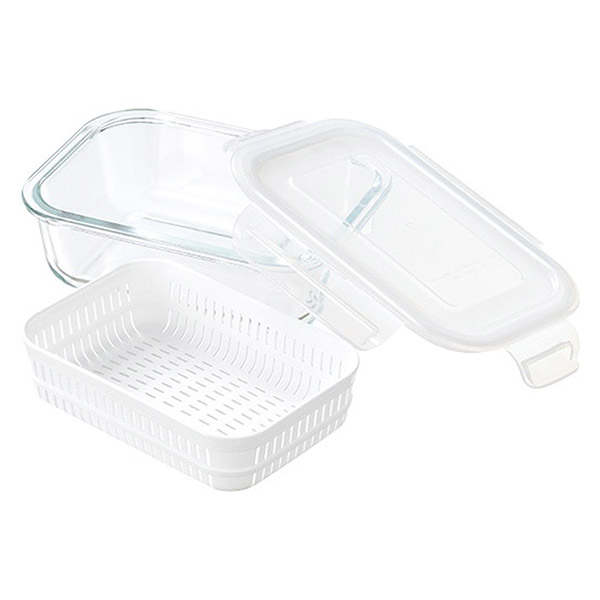 内容:●商品:約17.5×13×6.2cm ●材質:本体/耐熱ガラス、蓋・角ザル/ポリプロピレン ●中国製