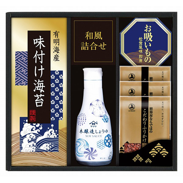 内容:●セット内容:こだわりふりかけ×3、有明海産味付け海苔(3切6枚)・ヤマサ鮮度卓上しょうゆ200ml・永谷園お吸いもの松茸風味(2袋入)各1 ●加工地:日本(乾海苔/国内産)【小麦】