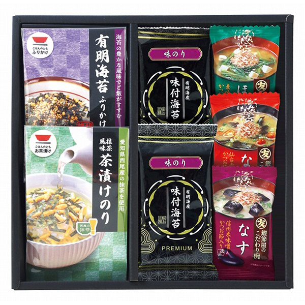 内容:●セット内容:有明海苔ふりかけ(2袋入)・抹茶風味茶漬けのり(2袋入)各1、有明海産味付海苔(8切6枚)×2、即席味噌汁(ほうれん草・なめこ・なす各1) ●加工地:日本(乾海苔/国内産)【小麦・エビ】