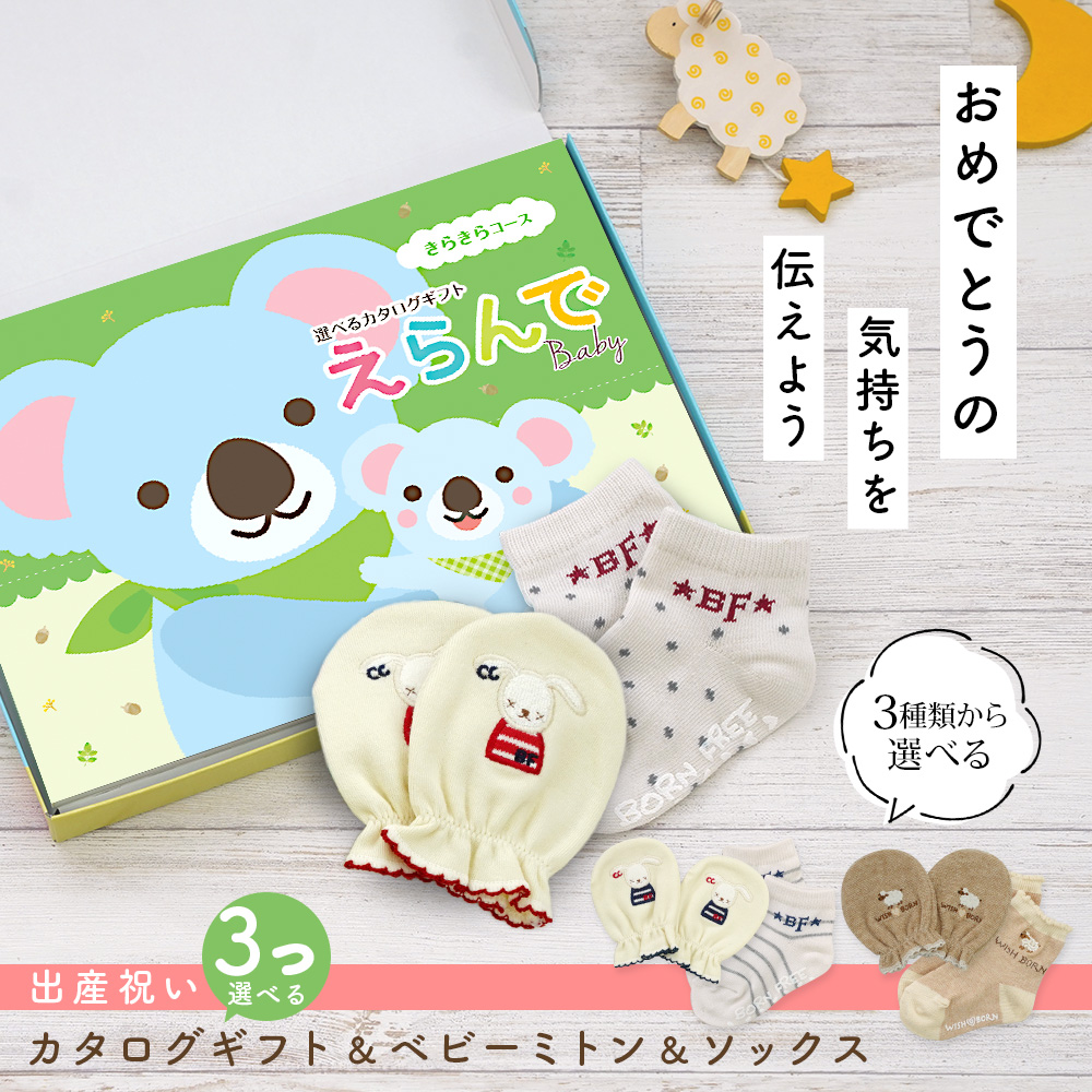 【セット内容】ベビーミトン1セット、ソックス1セット、カタログギフトえらんでBaby《きらきらコース》一冊(申込みはがき3枚)