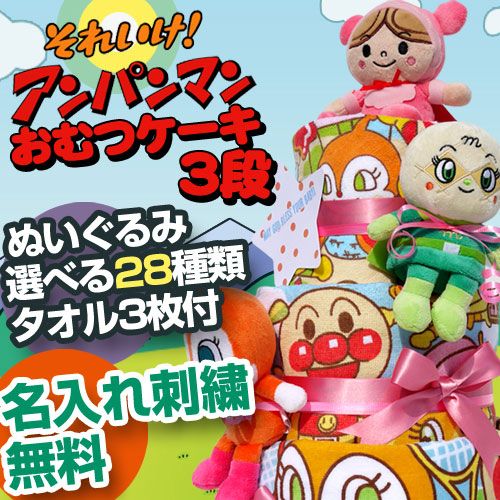 おむつケーキ 出産祝い アンパンマン 3段 おむつケーキ クリスマス プレゼント 名入れ刺繍 選べるぬいぐるみ